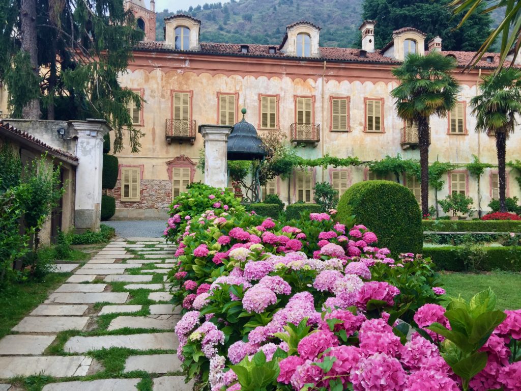 La struttura dell’area esterna presenta tre aree principali: il giardino, l’orto e la vigna, e il tradizionale “prà giardin”. Il giardino si articola su tre gradoni collegati da gradini di pietra. Il più alto è un piazzale a ghiaia prospiciente la casa padronale, al limitare del quale sono allineate le siepi di bosso scolpite che caratterizzano più diffusamente il secondo gradone.